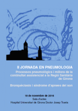 La sessió, enguany abordarà el processos pneumològics de les bronquèctasis i la síndrome d’apnees del son. La Jornada està pensada per millorar l’assistència d’aquests dos processos a l’àrea de la Regió Sanitaria de Girona, i té per objectius específics millorar la continuïtat assistencial entre diferents àmbits (atenció primària/hospitals comarcals/hospital de referència) i consensuar vies de comunicació i protocols d’actuació. Està especialment pensada per especialistes en medicina familiar i comunitària, pneumòlegs i altres especialistes interessats en la pneumologia.